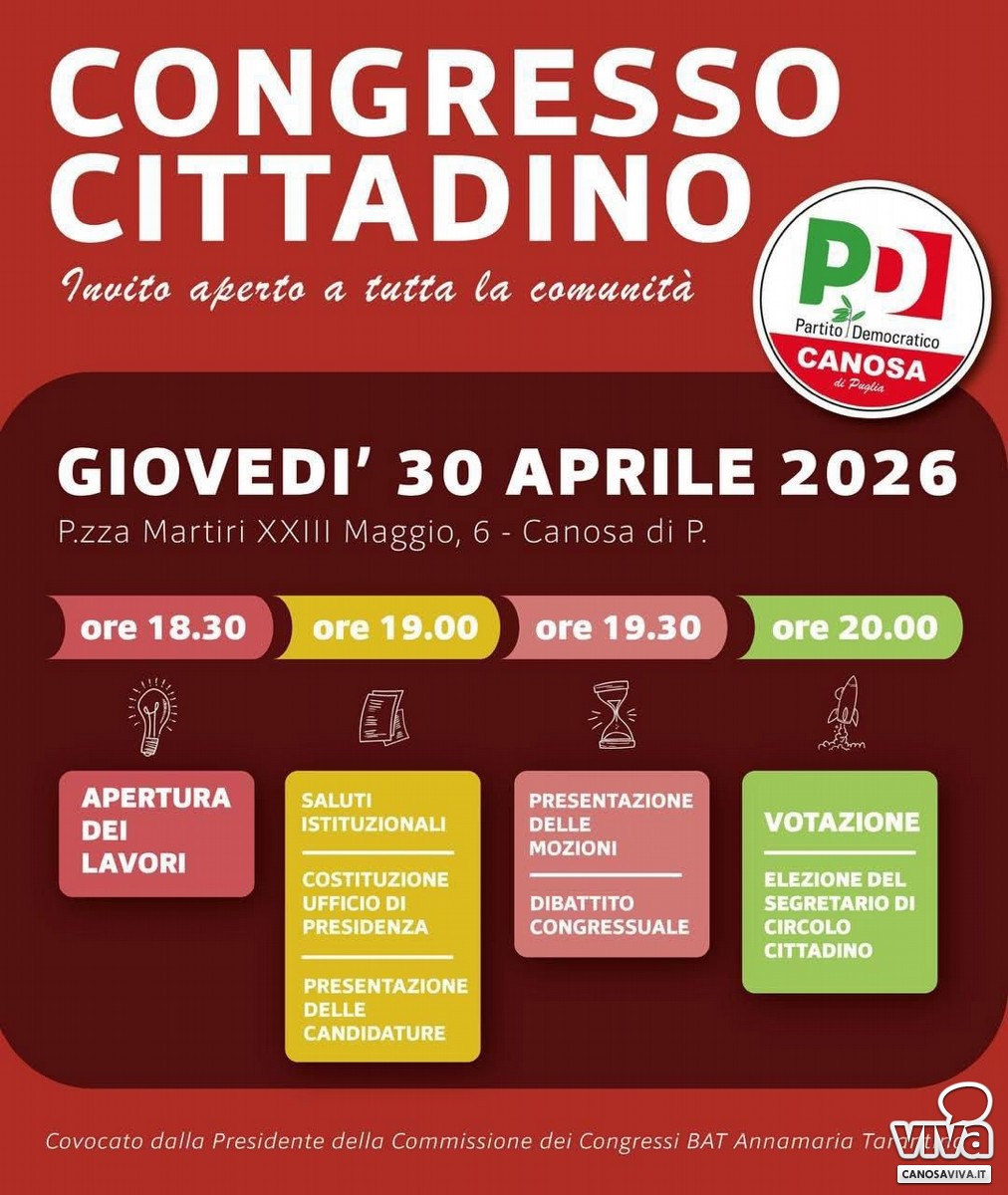 A Canosa di Puglia si terrà un importante appuntamento politico aperto alla cittadinanza: il congresso cittadino del Partito Democratico. L'incontro è in programma giovedì 30 aprile 2026 presso Piazza Martiri XXIII Maggio 6.