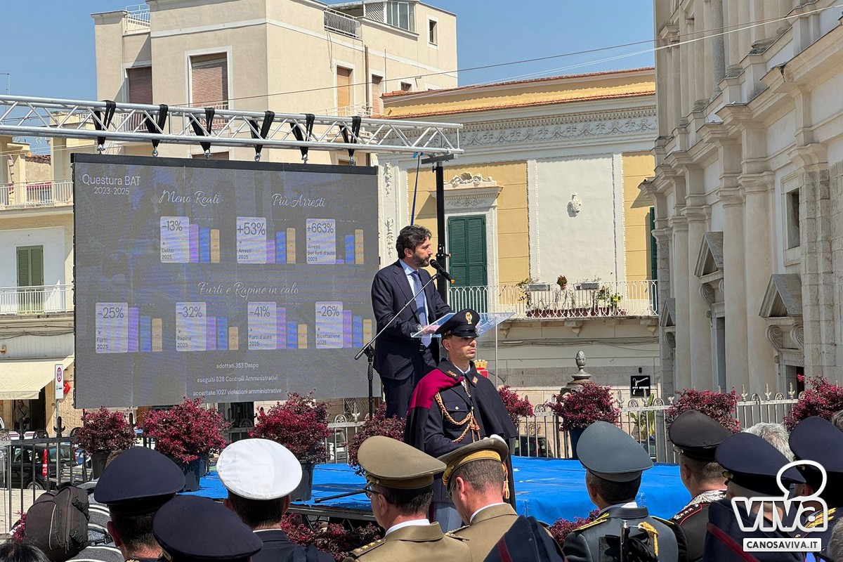 «Dateci fiducia e vi daremo sicurezza», sono state le parole con cui il Questore Fabbrocini ha aperto il suo discorso. Subito dopo sono stati illustrati alcuni numeri relativi al biennio 2023-2025 che testimoniano l'impegno della Polizia di Stato: la Questura della BAT ha controllato 370.000 persone e 165.000 veicoli, ha adottato 350 provvedimenti DASPO, oltre 838 controlli amministrativi e 1.027 violazioni amministrative accertate.