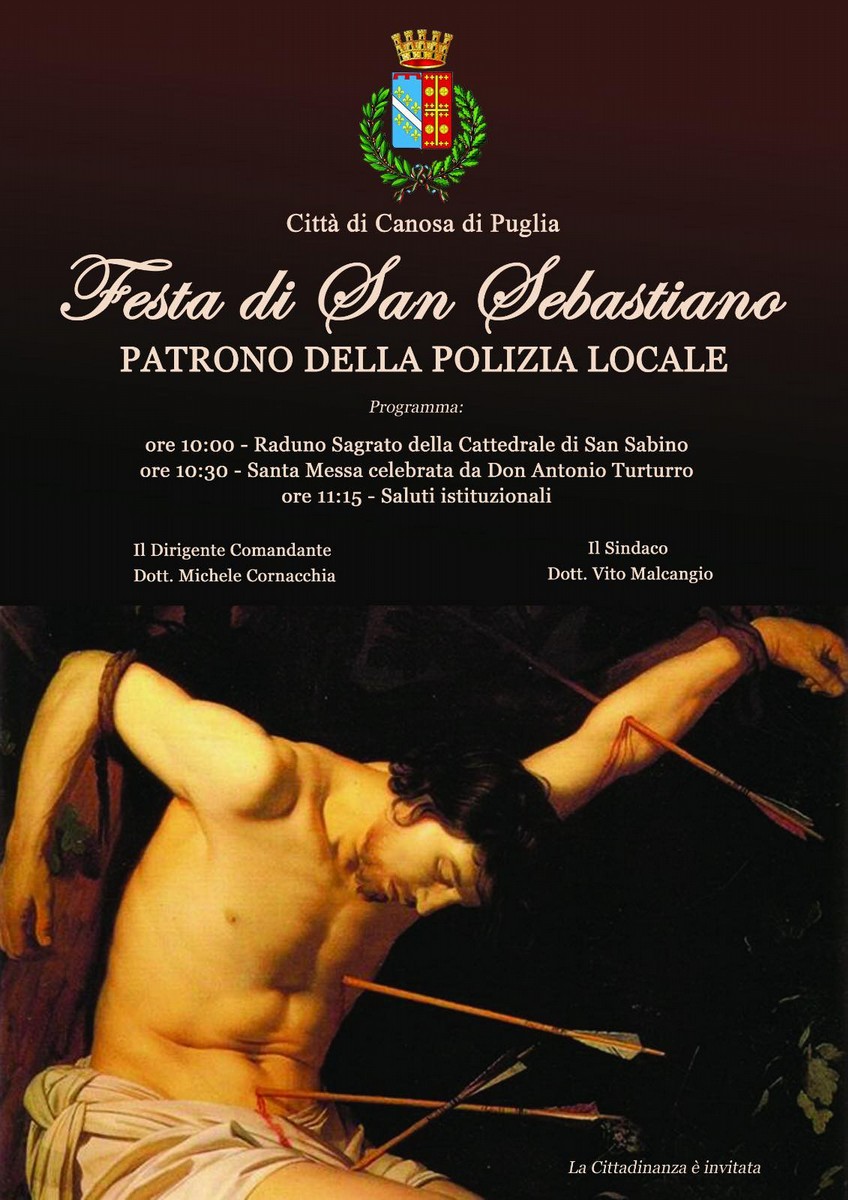 Il Comune di Canosa di Puglia rende noto che domani, martedì 20 gennaio, ricorre la Festa di San Sebastiano, Patrono della Polizia Locale. In tale occasione, alle ore 10.30, presso la Basilica Cattedrale di San Sabino, sarà celebrata la Santa Messa in onore del Santo Patrono, officiata dal Cappellano don Antonio Turturro.