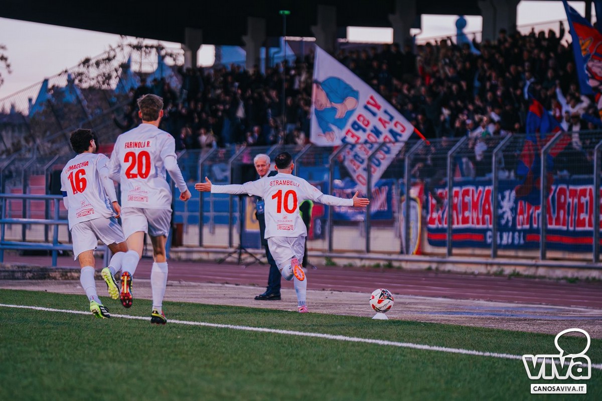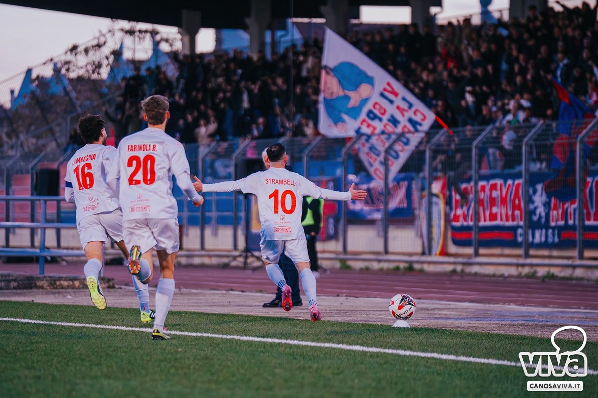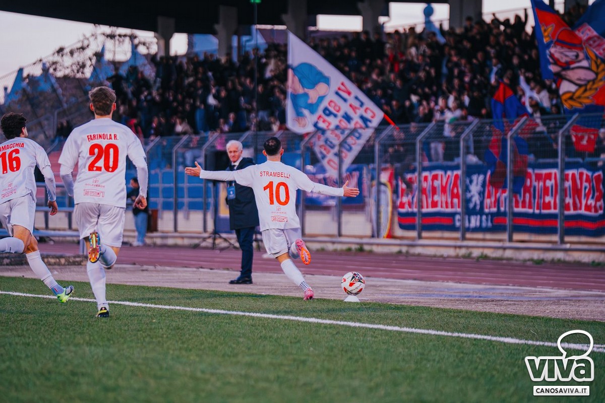 E grande Canosa è stato, trascinato da quell'autentico lusso per la categoria che fa Nicola di nome, e Strambelli di cognome, con quel mirabile arcobaleno mancino a beffare un incerto Centonze.